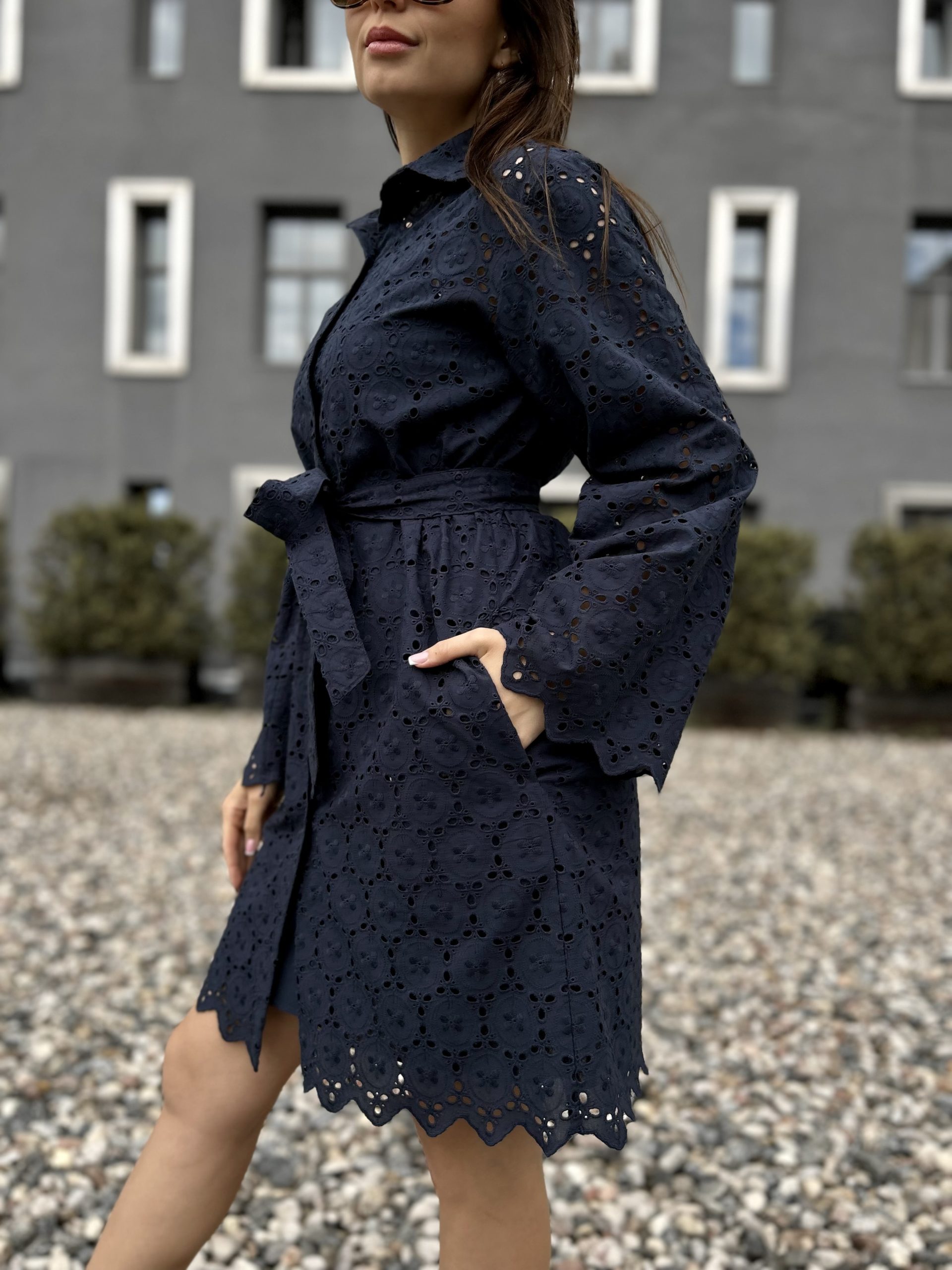 - Brīva piegriezuma kleita ar garām paplatinātām piedurknēm.