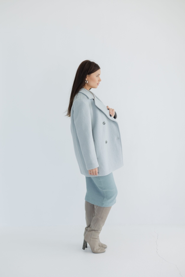 Modelei: Mēteļjaka S izmērs. Modeles parametri: auguma garums 174cm, krūšu apkārtmērs 80cm, viduklis apkārtmērs 63cm, gurni apkārtmērs 94cm.