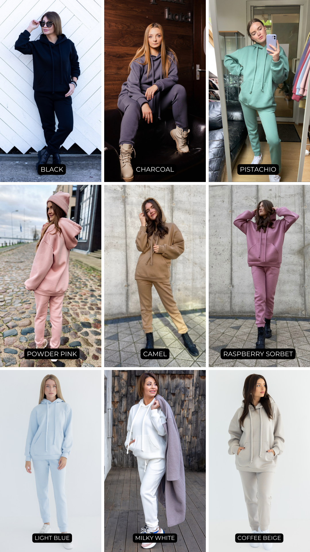 BLACK, CHARCOAL, COFFEE BEIGE, LIGHT BLUE, MILKY WHITE, POWDER PINK, RASPBERRY SORBET